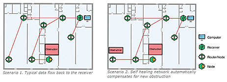 這些無線數(shù)據(jù)記錄節(jié)點是電池供電的裝置,將記錄的數(shù)據(jù)傳輸回用戶指定的時間間隔的中央接收器。他們克服了傳統(tǒng)的無線日志記錄系統(tǒng)的一個主要問題,在每個節(jié)點不必在直接與接收器的通信。每個節(jié)點可以設(shè)置在雙目的模式下,通過連接到交流電源,作為一個數(shù)據(jù)記錄節(jié)點,以及作為一個路由器從其他節(jié)點上傳遞的數(shù)據(jù)。通過路由器和數(shù)據(jù)日志節(jié)點的組合,系統(tǒng)形成一個自愈網(wǎng)絡(luò),以確保數(shù)據(jù)到達接收器,通過一個備用路徑,應(yīng)現(xiàn)有的路徑失敗或被阻礙。