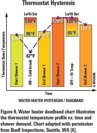 通過使用多通道溫度記錄儀的科學(xué)方法和分析,Buildera解決了多年來困擾房主的冷水淋浴的挫折。對溫度分布隨時(shí)間的改進(jìn)的理解產(chǎn)生了平衡熱噴淋的相反需求和能量效率的合理解決方案。將恒溫器設(shè)置提高約10ºF至130ºF可確保全年有足夠的熱水。在早上重新啟動現(xiàn)有的循環(huán)管道是一個(gè)替代選擇。在分析期間,注意到其他觀察和改進(jìn)以減輕細(xì)菌堆積,同時(shí)防止在使用點(diǎn)的燙傷,包括在水加熱器輸出處添加溫度補(bǔ)償混合閥,與在該點(diǎn)的防燙傷夾具的使用。