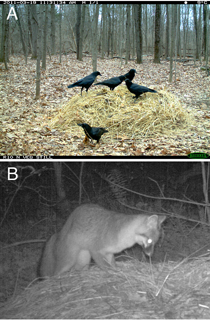 圖1.在堆肥清理野生動(dòng)物。 (A)五,烏鴉(烏鴉座brachyrhynchos)和(B)灰狐(灰狐屬cinereoargenteus),兩者共同的游客。