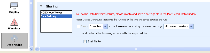 數(shù)據(jù)傳輸?shù)氖走x項(xiàng)可能包括來(lái)自舊網(wǎng)絡(luò)部署的設(shè)置文件的名稱。如果啟用數(shù)據(jù)傳送并使用舊部署中保存的設(shè)置,您將看到一條消息,指示“找不到所選傳感器的數(shù)據(jù)”。從當(dāng)前部署中選擇一個(gè)設(shè)置文件,或使用“繪圖/導(dǎo)出無(wú)線數(shù)據(jù)”創(chuàng)建一個(gè)新的設(shè)置文件。
