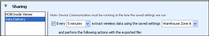 確保您希望在數(shù)據(jù)文件中共享的所有傳感器都顯示在要繪制/導(dǎo)出的傳感器列表中。 選擇預(yù)設(shè)并選擇預(yù)設(shè)的時(shí)間范圍,以確定每次數(shù)據(jù)傳送運(yùn)行時(shí)將導(dǎo)出多少數(shù)據(jù)。 在此示例中,我們選擇了“過(guò)去12小時(shí)”,這意味著只有過(guò)去12小時(shí)的數(shù)據(jù)將通過(guò)數(shù)據(jù)傳送導(dǎo)出。 顯示最近12小時(shí)的數(shù)據(jù)供參考。 單擊保存設(shè)置按鈕,然后鍵入一個(gè)名稱,該名稱也將用于數(shù)據(jù)傳遞文件名,并按Enter鍵。 您的配置設(shè)置將被保存。 1.打開(kāi)HOBOnode管理器。 2.單擊操作按鈕,然后選擇編輯HOBO數(shù)據(jù)節(jié)點(diǎn)首選項(xiàng)。 3.選擇共享,然后選擇數(shù)據(jù)傳送。 4.選擇要從網(wǎng)絡(luò)中保存數(shù)據(jù)的頻率(從1分鐘到7天)。這將確定您用來(lái)共享數(shù)據(jù)的日程表。 5.選擇在繪圖/導(dǎo)出無(wú)線數(shù)據(jù)中創(chuàng)建的保存設(shè)置的名稱,例如上述示例中的“倉(cāng)庫(kù)區(qū)A”。 6.選擇您要共享文件的方式:通過(guò)電子郵件,F(xiàn)TP或保存到計(jì)算機(jī)或網(wǎng)絡(luò)位置。您可以選擇多種共享文件的方法。 電子郵件: 鍵入要發(fā)送文件的電子郵件地址,如果要在通過(guò)電子郵件發(fā)送之前壓縮文件,請(qǐng)選中該復(fù)選框。注意:數(shù)據(jù)傳輸使用為警報(bào)電子郵件通知配置的相同電子郵件設(shè)置。如果您從未配置過(guò)警報(bào)電子郵件,則必須先執(zhí)行此操作,即使您不打算設(shè)置任何警報(bào)。 輸入要放置文件的FTP位置的FTP服務(wù)器名稱,目錄名稱(遠(yuǎn)程文件夾),用戶名和密碼。 測(cè)試FTP連接以確保其成功將文件傳送到指定位置。 如果要在通過(guò)FTP傳送文件之前壓縮文件,請(qǐng)選中該復(fù)選框。 選擇是否要在每次傳輸新文件時(shí)在該FTP位置覆蓋現(xiàn)有文件,或者每次要?jiǎng)?chuàng)建新的帶時(shí)間戳的文件。 將其保存到硬盤驅(qū)動(dòng)器或網(wǎng)絡(luò): 選擇要保存文件的目錄。 選擇是否要在每次保存文件時(shí)覆蓋文件,或者每次要?jiǎng)?chuàng)建新文件。 完成配置數(shù)據(jù)傳遞設(shè)置后,在首選項(xiàng)窗口中單擊“確定”。 然后,將根據(jù)您選擇的計(jì)劃保存和共享來(lái)自數(shù)據(jù)網(wǎng)絡(luò)的傳感器數(shù)據(jù)。數(shù)據(jù)將保存為.txt,.csv或.xls文件,您可以導(dǎo)入到HOBOware,Microsoft Excel和其他程序進(jìn)行分析。文件類型由“首選項(xiàng)”中的導(dǎo)出設(shè)置確定。 筆記: 除非設(shè)備通信也在運(yùn)行,否則數(shù)據(jù)傳送將不會(huì)運(yùn)行。這意味著如果您選擇在關(guān)閉HOBOnode Manager時(shí)停止設(shè)備通信,則數(shù)據(jù)傳輸也將停止。重新啟動(dòng)設(shè)備通信后,將按照先前配置的計(jì)劃重新開(kāi)始數(shù)據(jù)傳輸。 或這個(gè): 更多HOBO記錄儀信息,請(qǐng)?jiān)L問(wèn)HOBO中國(guó)官網(wǎng):http://www.521yk.com/