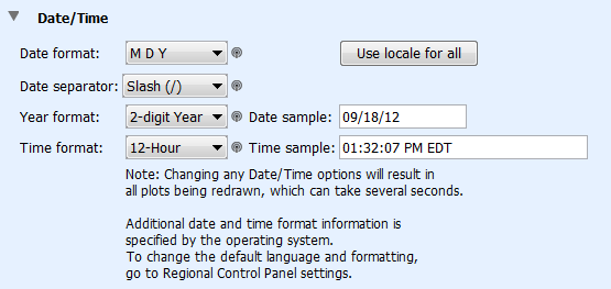 這些設(shè)置控制日期和時(shí)間在HOBOware中的顯示方式。 您所做的更改將顯示在日期和時(shí)間示例中。 在更改日期和時(shí)間顯示時(shí)可能打開(kāi)的任何繪圖都需要重繪繪圖,這可能需要幾秒鐘。 如首選項(xiàng)中所述,超出這些設(shè)置中指定的格式的日期和時(shí)間由計(jì)算機(jī)操作系統(tǒng)確定。 注意:導(dǎo)出文件時(shí),導(dǎo)出的日期和時(shí)間由“首選項(xiàng)”中的“導(dǎo)出設(shè)置”導(dǎo)出(年份格式除外,該格式僅由顯示類(lèi)別中的這些日期/時(shí)間設(shè)置控制)如果在Excel中打開(kāi)文件 ,日期和時(shí)間可能會(huì)自動(dòng)重新格式化為Excel的默認(rèn)日期和時(shí)間格式,您可以在Excel中自定義。