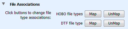 默認(rèn)情況下,擴(kuò)展名為.hobo,.hsec和.hproj(HOBO文件)和.dtf和.dsec(DTF文件)的文件將自動(dòng)與HOBOware相關(guān)聯(lián)。這意味著這些文件由HOBOware圖標(biāo)標(biāo)識(shí),并可以通過雙擊它們打開。單擊Map或UnMap按鈕更改文件類型關(guān)聯(lián)。