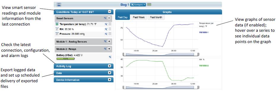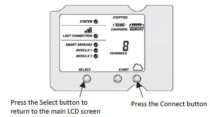 使用“選擇”按鈕返回到顯示所有傳感器和模塊的主LCD屏幕,然后按“連接”按鈕(云示例應(yīng)如圖所示可見)。這是HOBOlink識別新添加的傳感器所必需的。